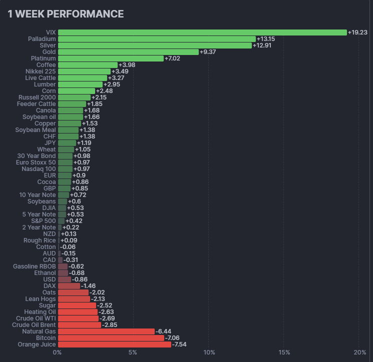 • Currencies (+0.4% | prev −1.0%): USD eased slightly after last week’s strength, supporting commodities and metals.